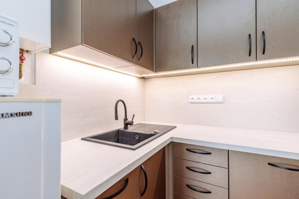Apartmán má 1 ložnici pro 3 osoby, obývací pokoj s rozkládacím gaučem pro 2 osoby, kuchyň s veškerým vybavením, mikrovlnnou troubou, posezení, TV s plochou obrazovkou a koupelnu se sprchou.