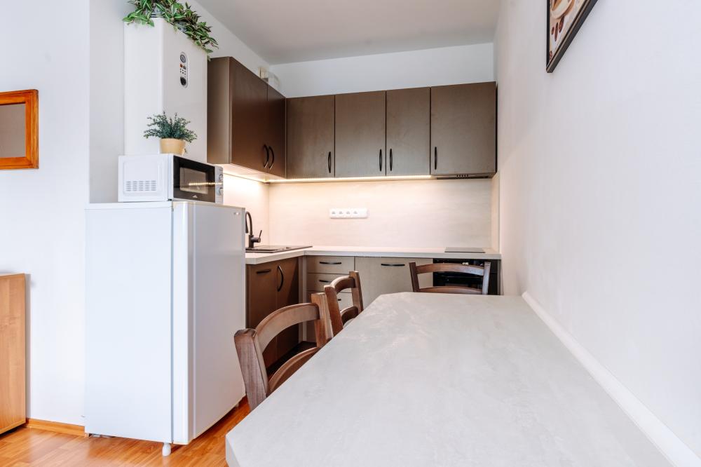 Apartmán má obývací pokoj s velkou postelí pro dvě osoby a rozkládací sedačku pro další dvě osoby, kuchyň s veškerým vybavením, myčkou, mikrovlnnou i klasickou troubou, TV s plochou obrazovkou a koupelnu se sprchou. Předností je luxusní prostředí apartmánu a terasa pro Vaši relaxaci.
