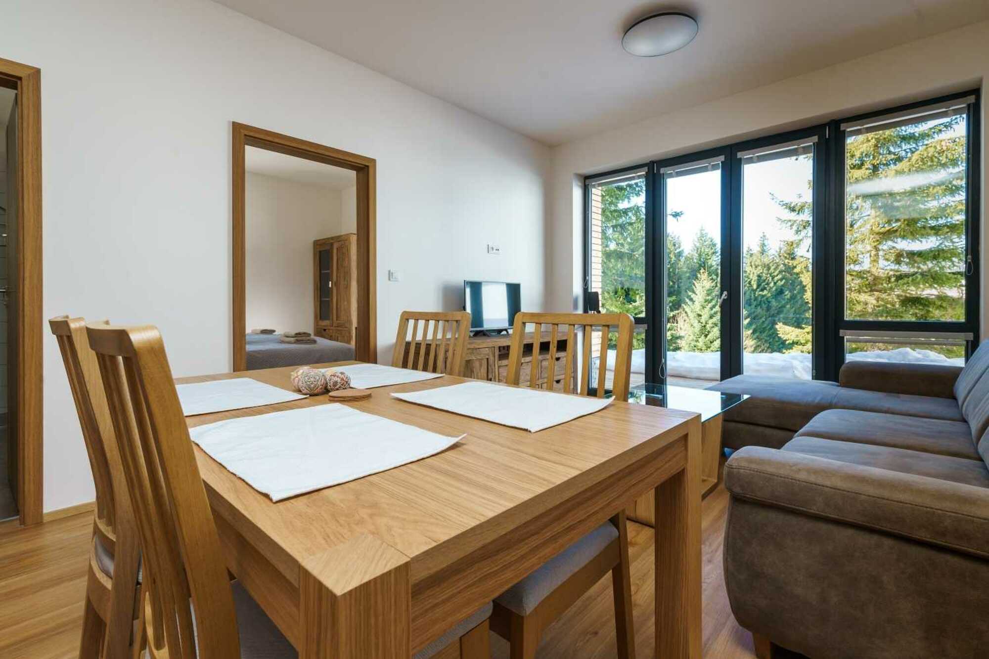 Apartmán má 2 ložnice pro 2+2 osoby, obývací pokoj s velkou sedačkou, kuchyň s veškerým vybavením, myčkou, mikrovlnnou i klasickou troubou, TV s plochou obrazovkou a koupelnu se sprchou. V apartmánu naleznete i pračku se sušičkou. Předností je luxusní prostředí apartmánu a dále nadstandardní terasa o rozloze 23m2 ze které je nádherný a nerušený výhled do údolí Loučné. Toto místo nabízí pohodovou a nerušenou relaxaci.
