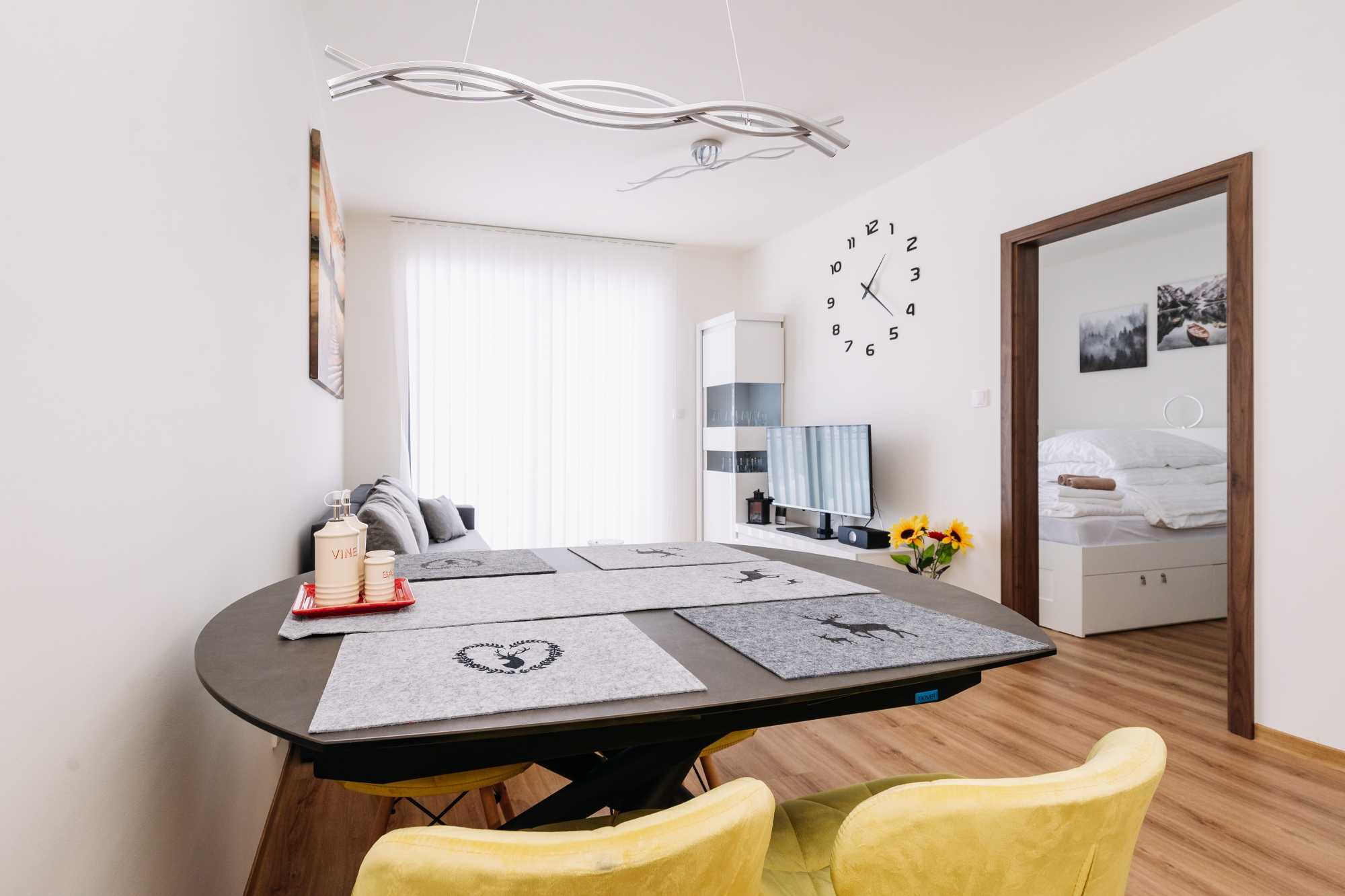 Zcela nový apartmán Temari 14 v domě dokončeném v roce 2023 Vám poskytne nádherný výhled na Klínovec a jeho sjezdovky. Můžete tak při ranním čaji či kávě zkontorolovat stav na sjezdovkách a výhled je doplněn i výhledem na Fichtelbert a Oberwiesenthal. Apartmán je uspořádán jako 2 kk s ložnicí pro 2 osoby a další 2 osoby mohou využít rokladací sofa v obývacím pokoji. Naleznete zde plně vybavený kuchyňský kout, kávovar, rychlovarnou konvici atd. Součástí apartmánu je i koupelna se spchovým koutem a WC. Apartmán dále nabízí uzamykatelnou kóji pro úschovu lyží a kol. Dále poskytuje 1 parkovací místo přímo u domu. Domací mazličci nejsou povoleni.