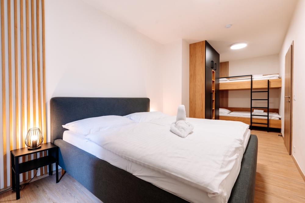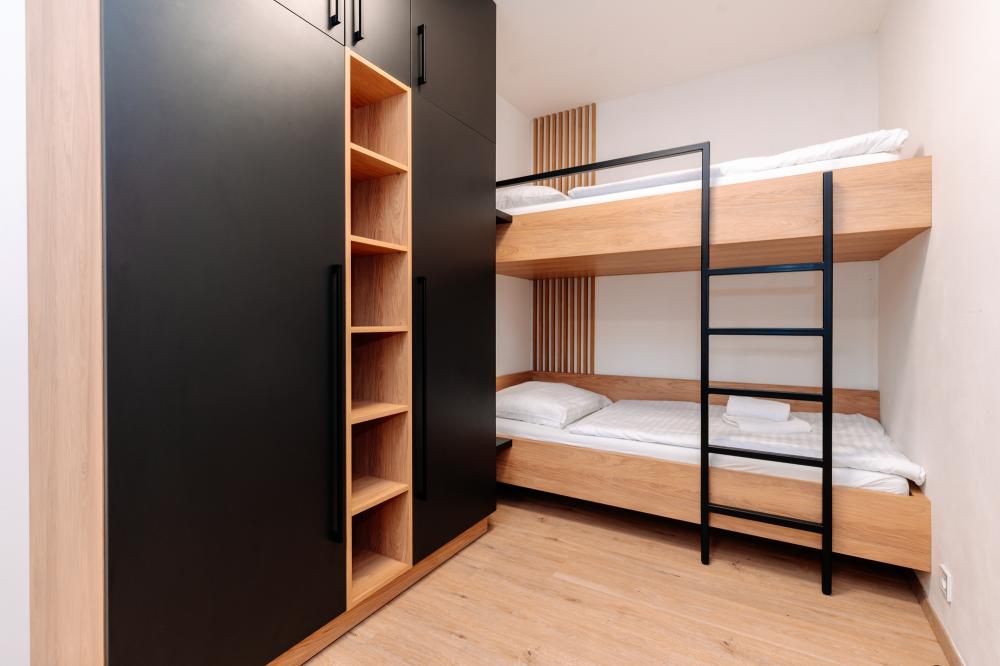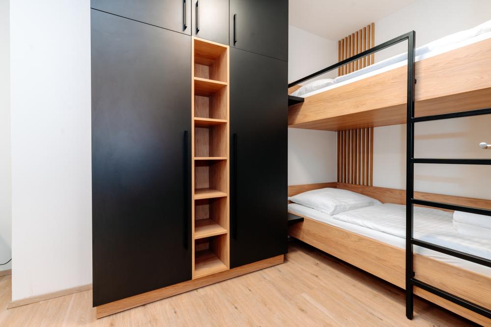- Typy postelí: 1x Velká manželská postel, 1x Lůžko na patrové posteli, 1x Rozkládací pohovka